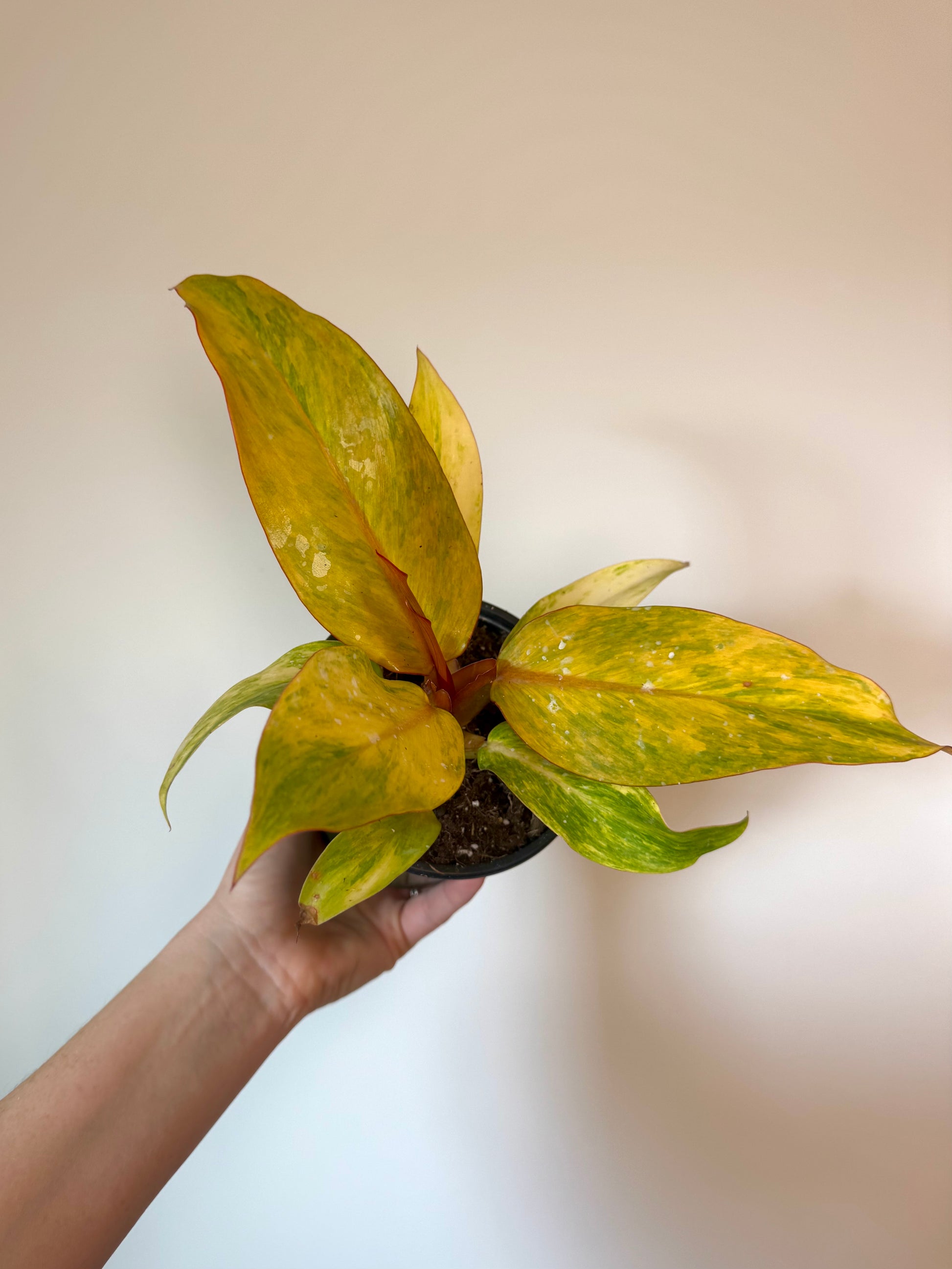 Philodendron Orange Marmalade is a rare and highly sought-after variety featuring stunning marbled foliage in shades of green, yellow, and warm orange. Each leaf emerges with bold color variation, making every plant truly one of a kind.
