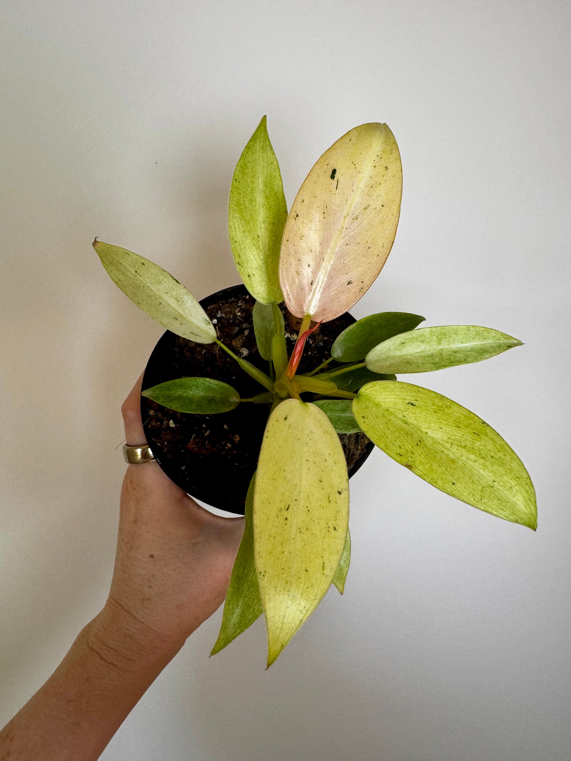 Bring a touch of the tropics to your home with Philodendron Whipple Way. This rare plant boasts pale, creamy white, pink or light green leaves with charming flecks of darker green and pink. No large chunks of dark green here! A unique addition to any space.