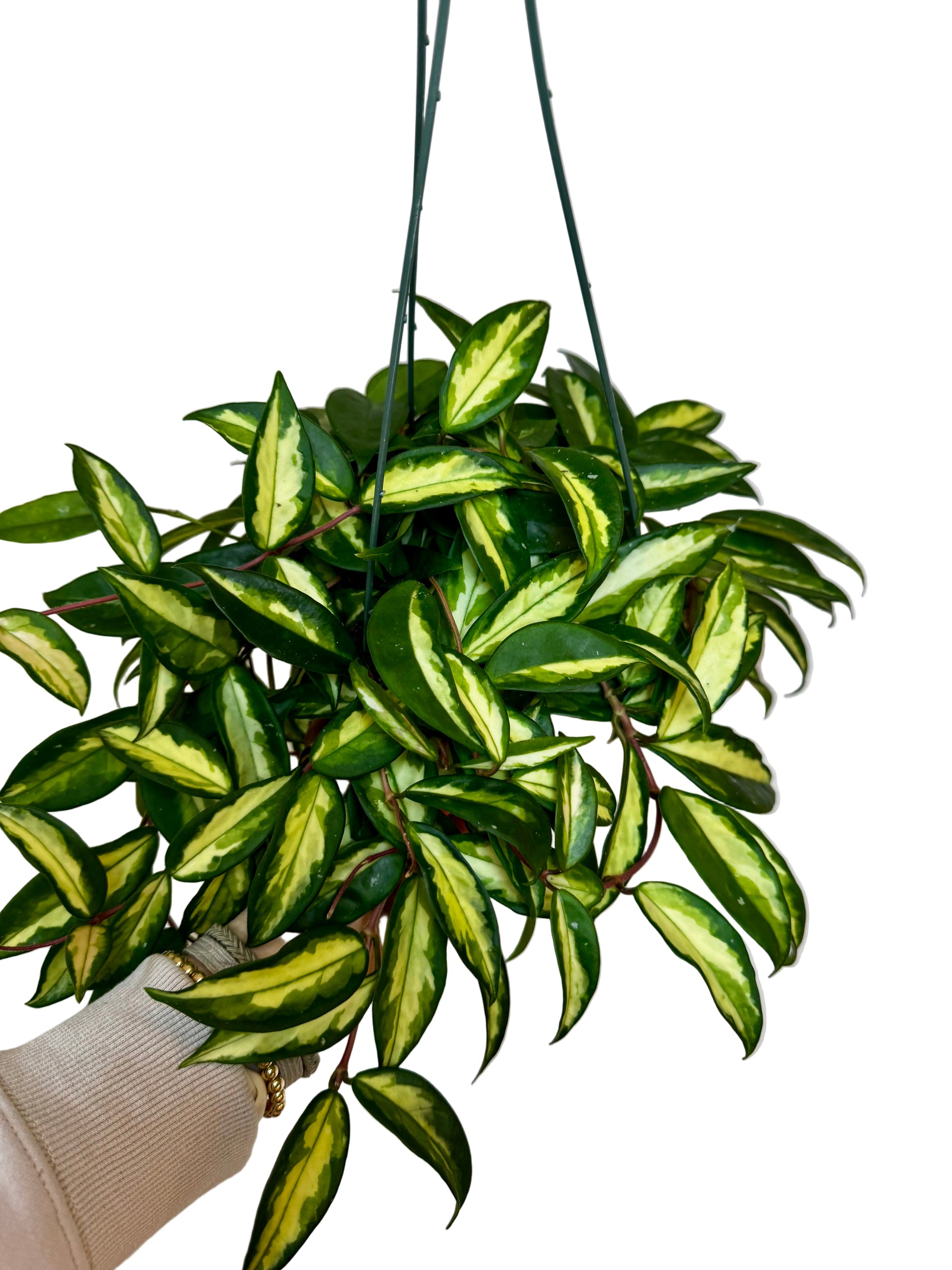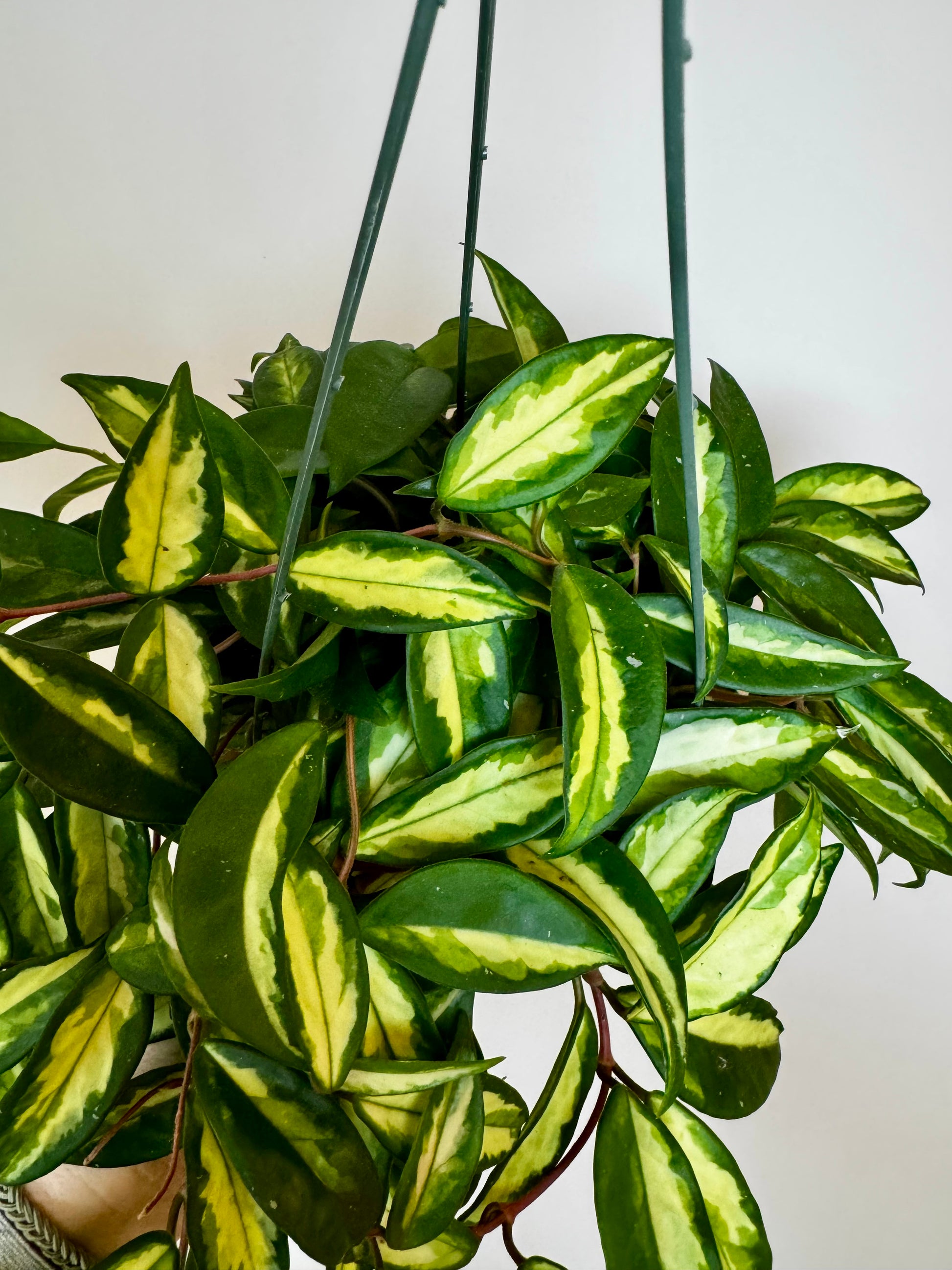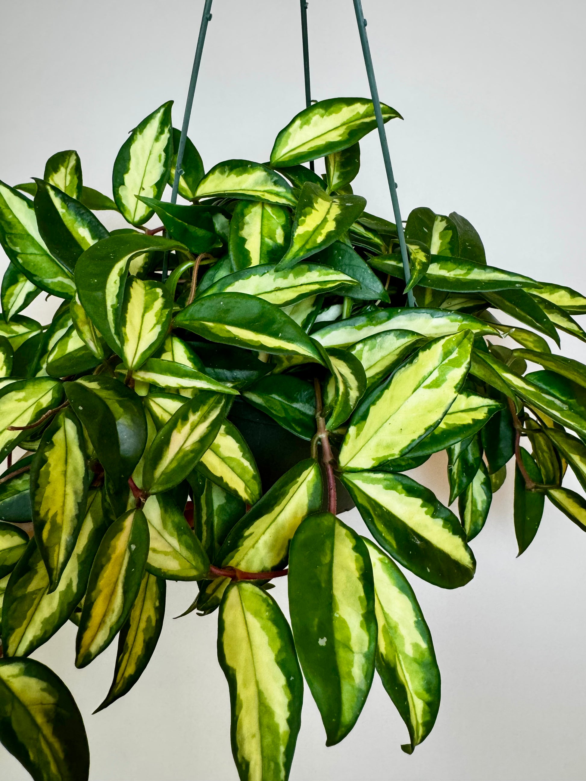 The Hoya Krimson Princess is a timeless classic with creamy variegated centers framed by glossy green edges. Its thick, waxy leaves and cascading growth make it a perfect choice for hanging baskets or shelving displays. With time, this beauty rewards you with clusters of star-shaped, pink-blushed blooms that add a delicate fragrance to your space.