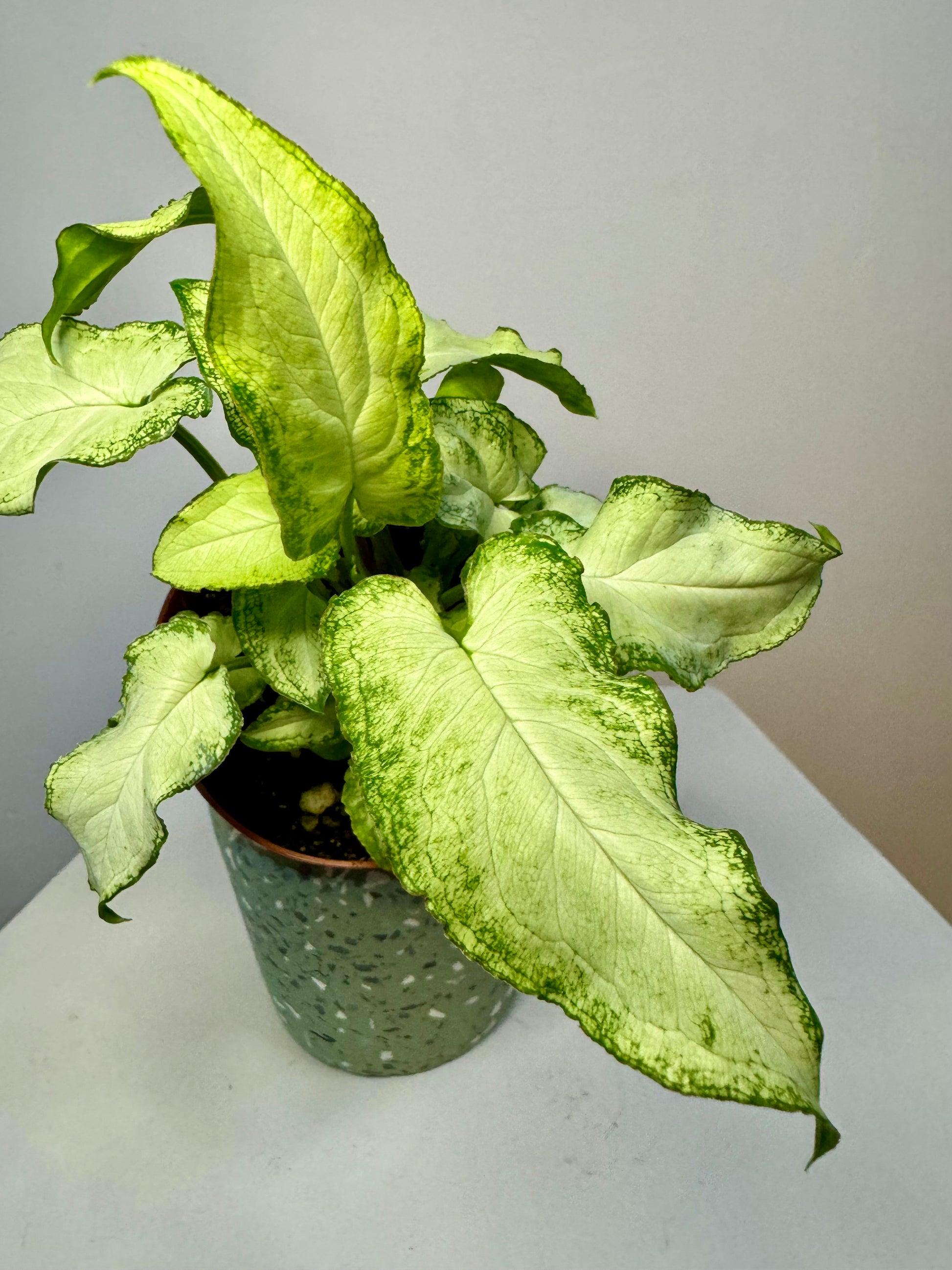 Experience the regal beauty of Syngonium 'Three Kings'! With its arrow shaped leaves and stunning splashes of marbled white and green variegation, this plant is a true masterpiece. Bring a touch of elegance and nature into your home with this unique and vibrant addition to your indoor garden.